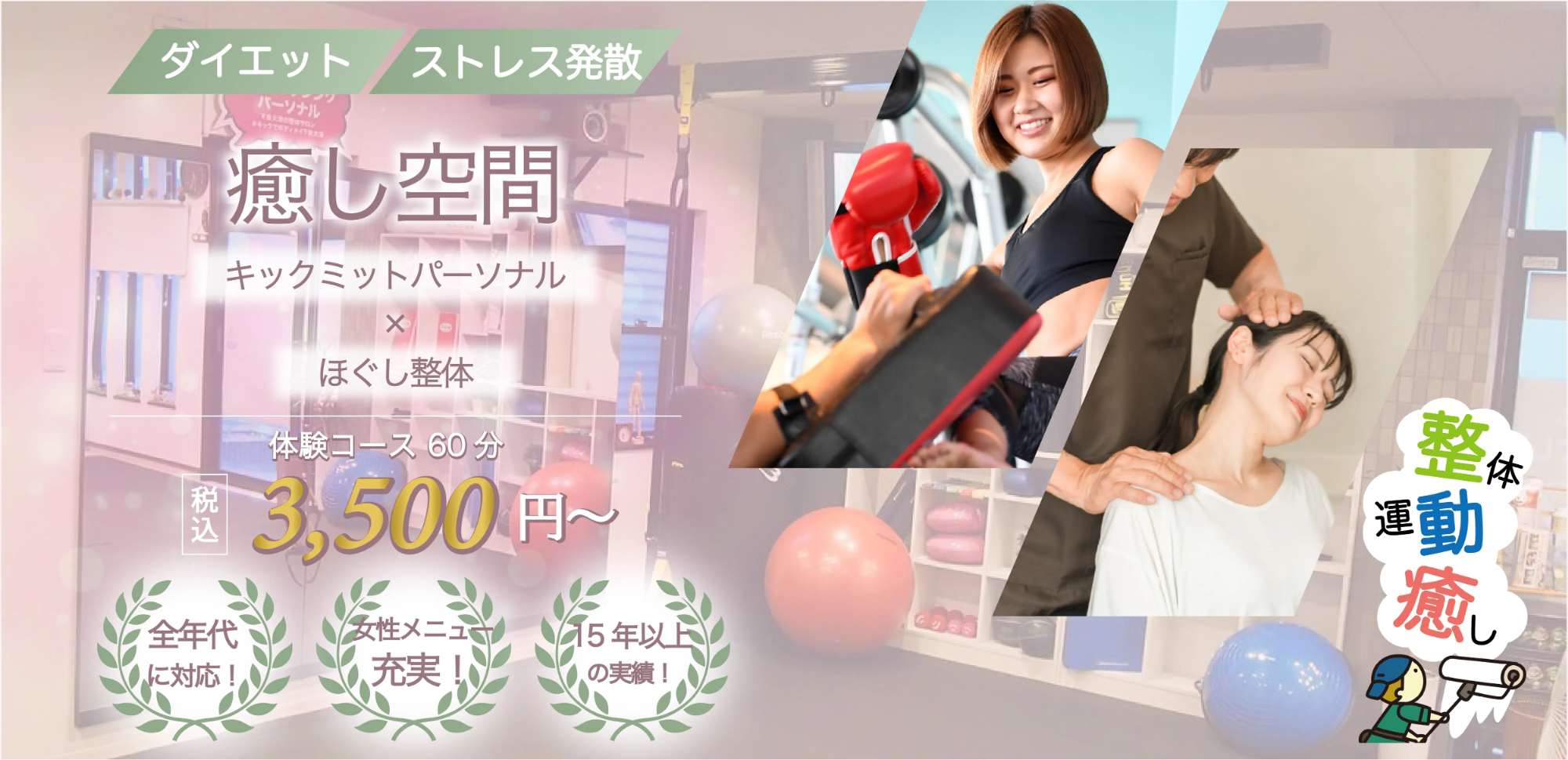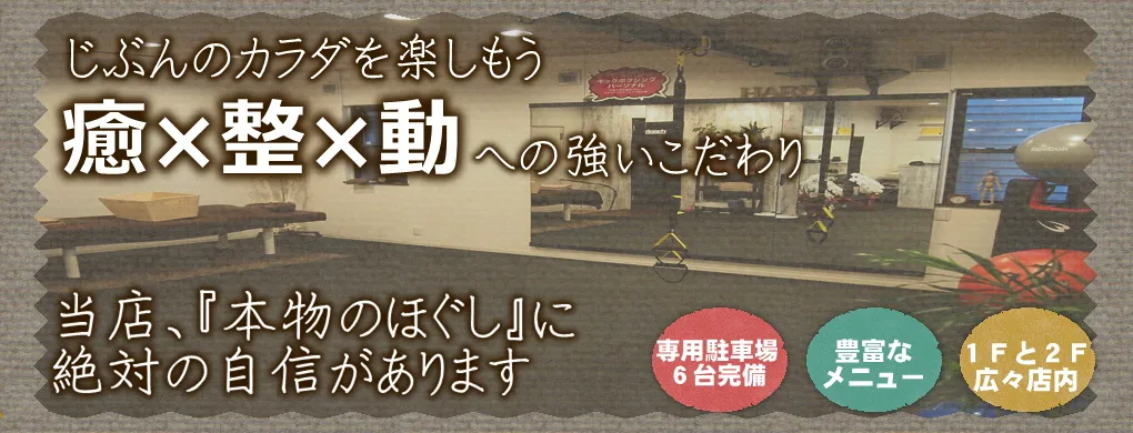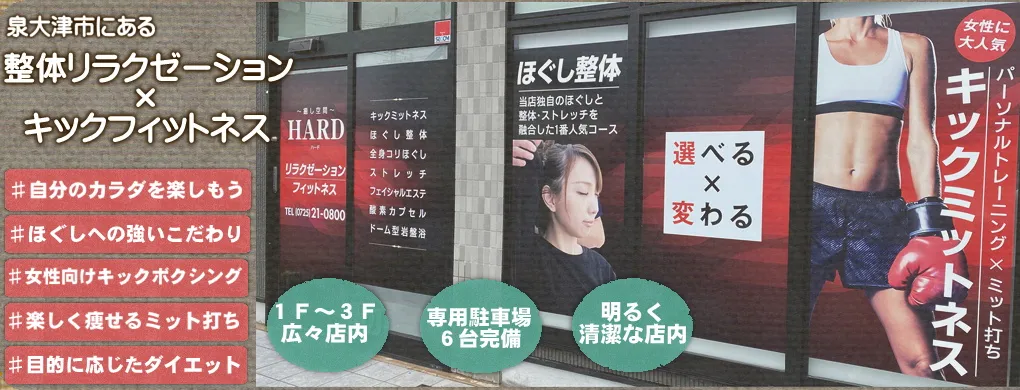 泉大津市で15年以上、【癒】【整】【動】の3つにこだわり続けるお店です。本物のほぐし技術による施術と、女性に人気のキックミットパーソナルトレーニングで、お子様からお年寄りまで、あなたの身体とこころの健康をサポートします。